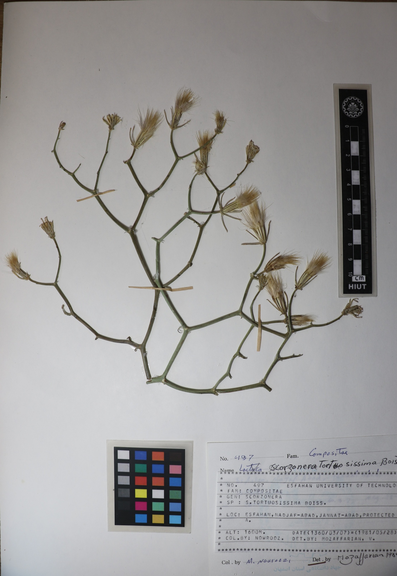 497 Family : Asteraceae (Compositae) Herbarium Number : 497 Species Name : Scorzonera Tortuosissima Boiss. herbarium date 5/28/1981 herbarium alternate 1600m herbarium col by M.Nowroozi herbarium det by V.Mozaffarian herbarium country Iran herbarium province Isfahan herbarium location Najaf abad herbarium lat herbarium long herbarium annotations