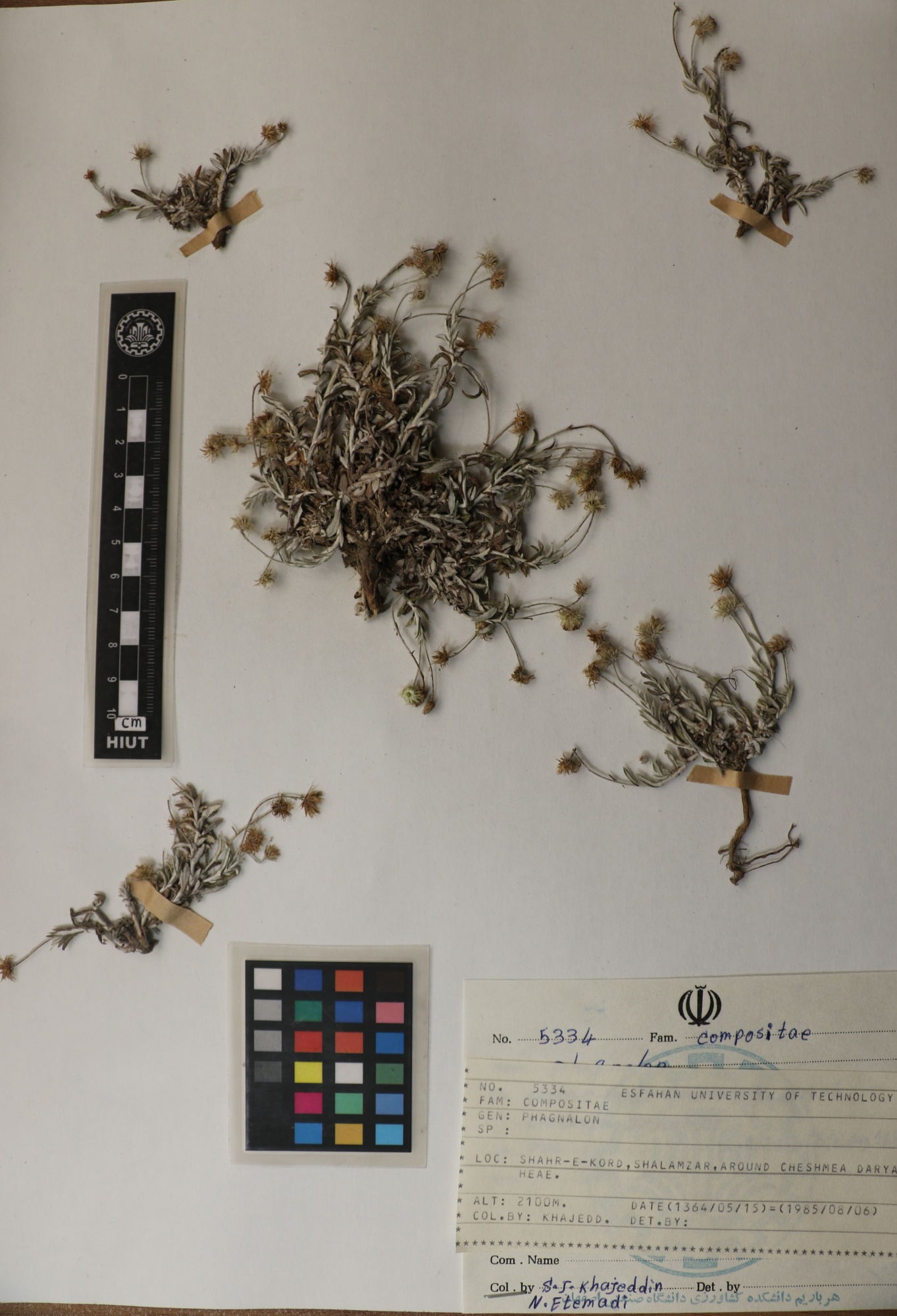 5334 Family : Asteraceae (Compositae) Herbarium Number : 5334 Species Name : Phagnalon herbarium date 8/6/1985 herbarium alternate 2100m herbarium col by S.J.Khajeddin herbarium det by herbarium country Iran herbarium province Isfahan herbarium location Shahr_e_kord herbarium lat herbarium long herbarium annotations