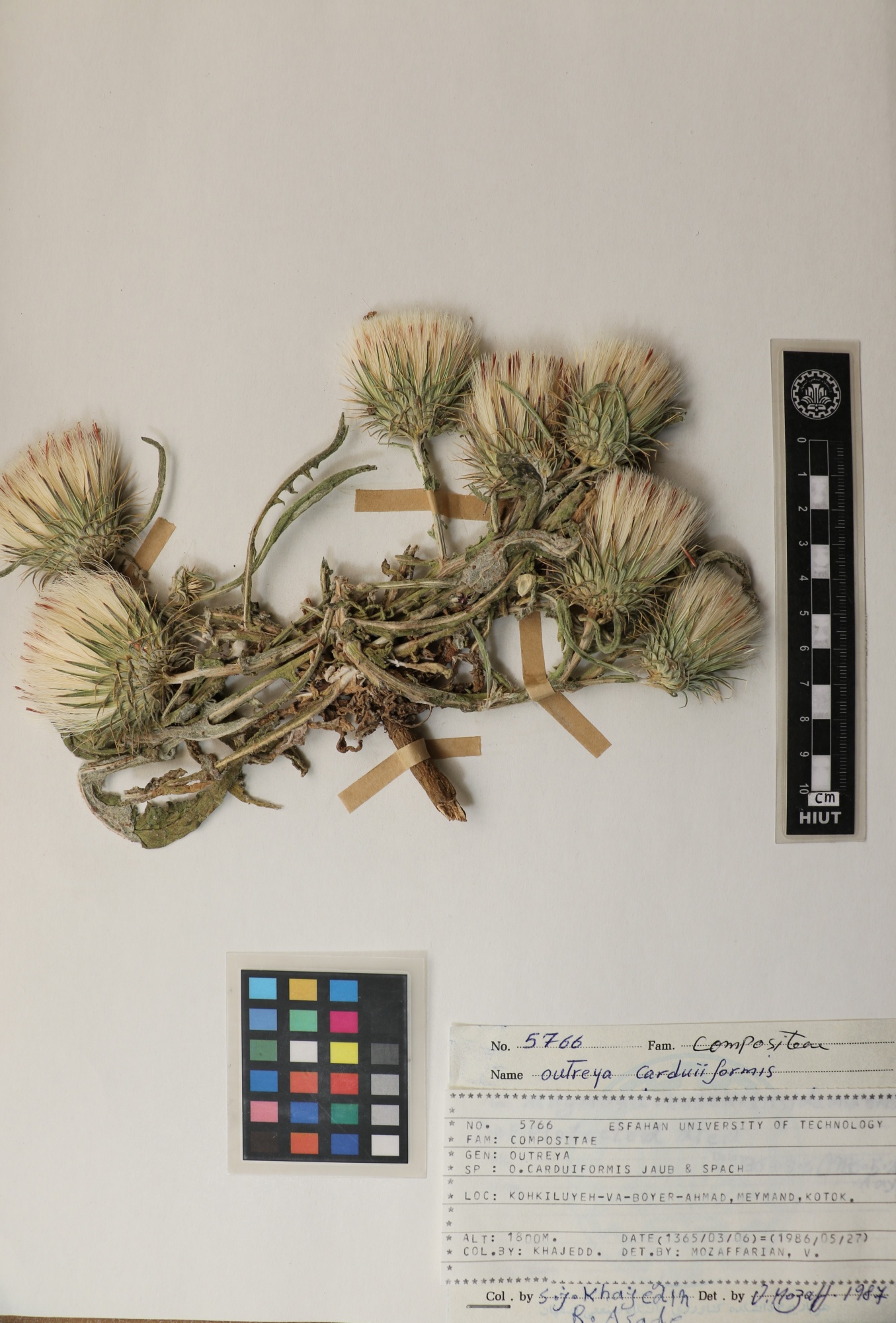 5766 Family : Asteraceae (Compositae) Herbarium Number : 5766 Species Name : Outreya carduiformis herbarium date 5/27/1986 herbarium alternate 1800m herbarium col by S.J.Khajeddin herbarium det by V.Mozaffarian herbarium country Iran herbarium province Kohkiluyeh_va_boyer_ahmad herbarium location Meymand herbarium lat herbarium long herbarium annotations