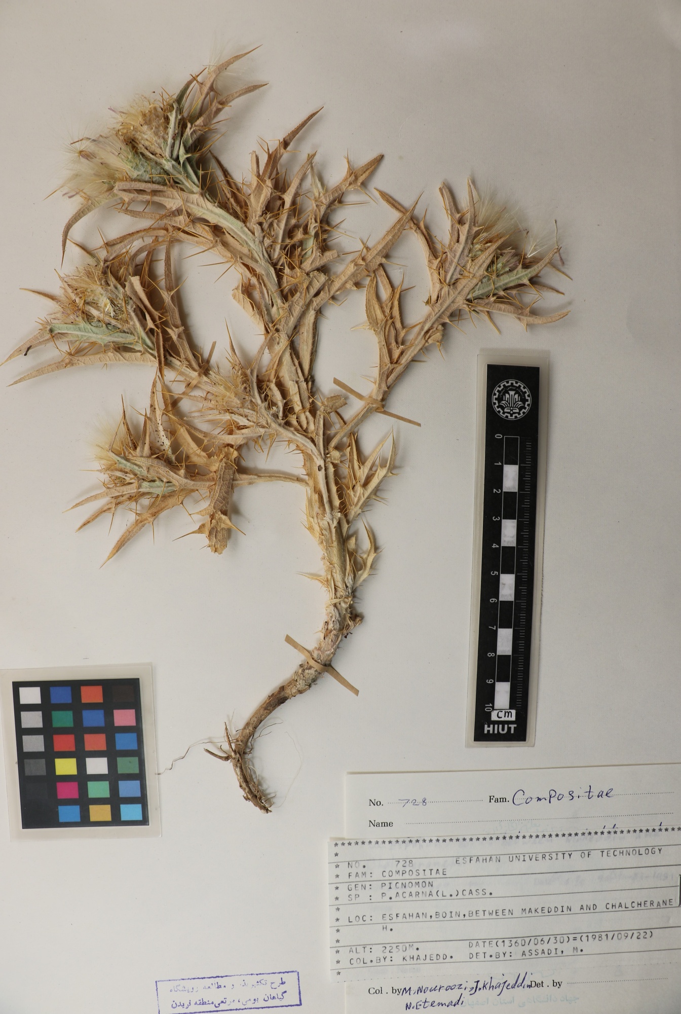728 Family : Asteraceae (Compositae) Herbarium Number : 728 Species Name : Picnomon Acarna(L.)Cass. herbarium date 9/22/1981 herbarium alternate 2250m herbarium col by S.J.Khajeddin herbarium det by M.Assadi herbarium country Iran herbarium province Isfahan herbarium location Boin herbarium lat herbarium long herbarium annotations