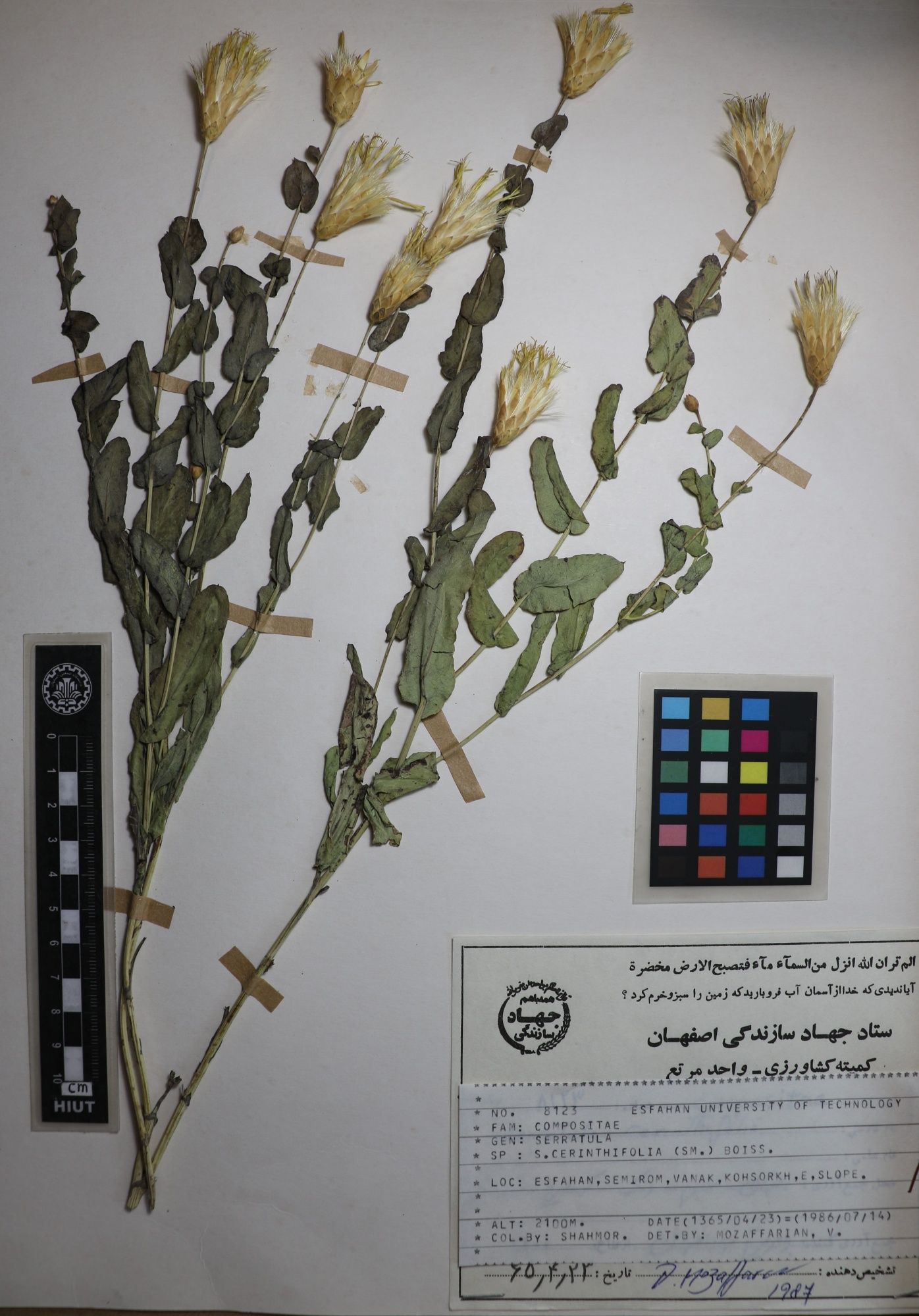 8123 Family : Asteraceae (Compositae) Herbarium Number : 8123 Species Name : Serratula cerinthifolia (Sm.)Boiss. herbarium date 7/14/1986 herbarium alternate 2100m herbarium col by S.J.Khajeddin herbarium det by herbarium country Iran herbarium province Isfahan herbarium location Semirom herbarium lat herbarium long herbarium annotations