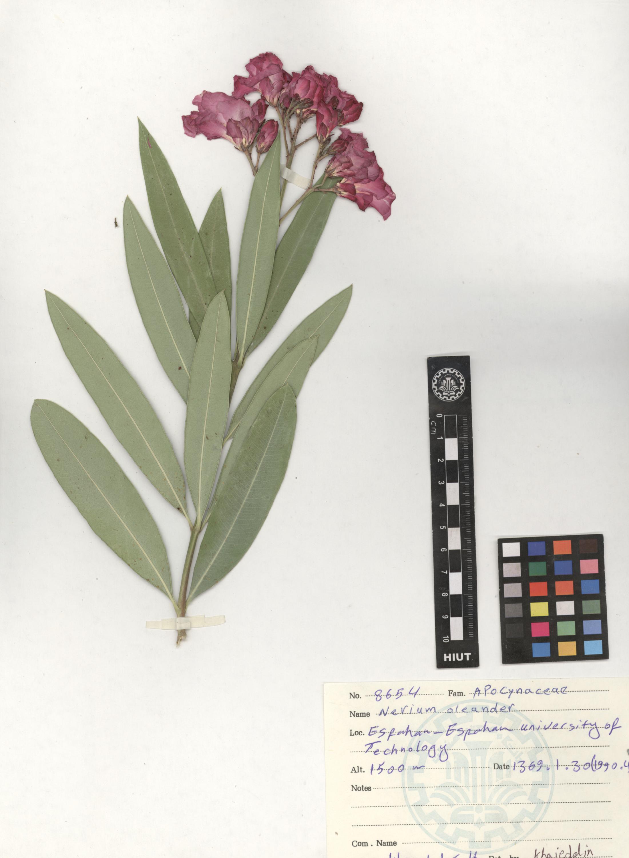 8654 Family : Apocynaceae Herbarium Number : 8654 Species Name : Nerium oleander herbarium date 3/23/1990 herbarium alternate 1500m herbarium col by Khonakdar H. herbarium det by Khajeddin S.J. herbarium country Iran herbarium province Isfahan herbarium location Isfahan university of technology herbarium lat herbarium long herbarium annotations