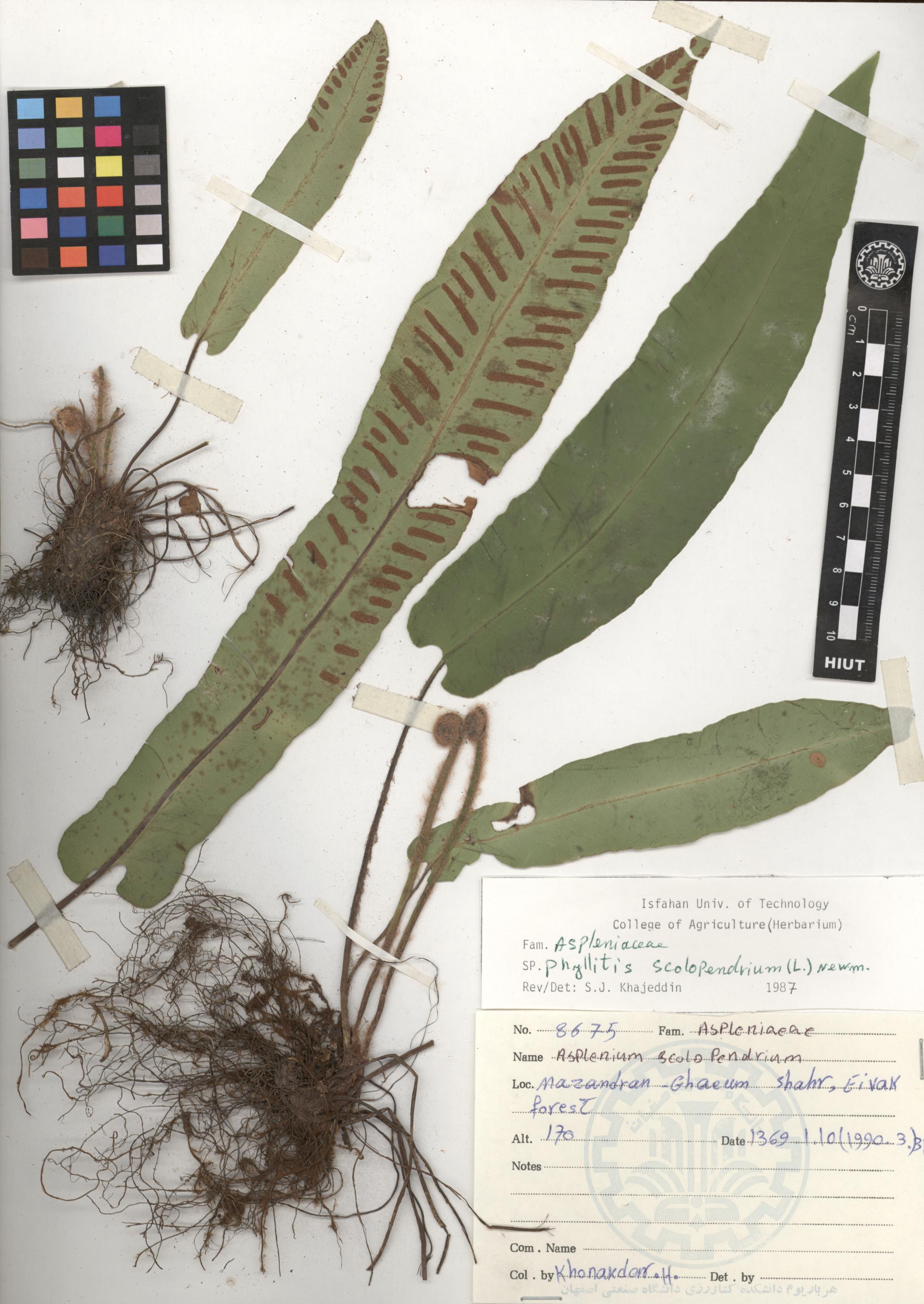 8675 Family : Aspleniaceae Herbarium Number : 8675 Species Name : Asplenium scolopendrium (L.)Newm. herbarium date 3/30/1990 herbarium alternate 170m herbarium col by Khonakdar H. herbarium det by Pourrezaei J. herbarium country Iran herbarium province Mazandaran herbarium location Ghaem shahr herbarium lat herbarium long herbarium annotations