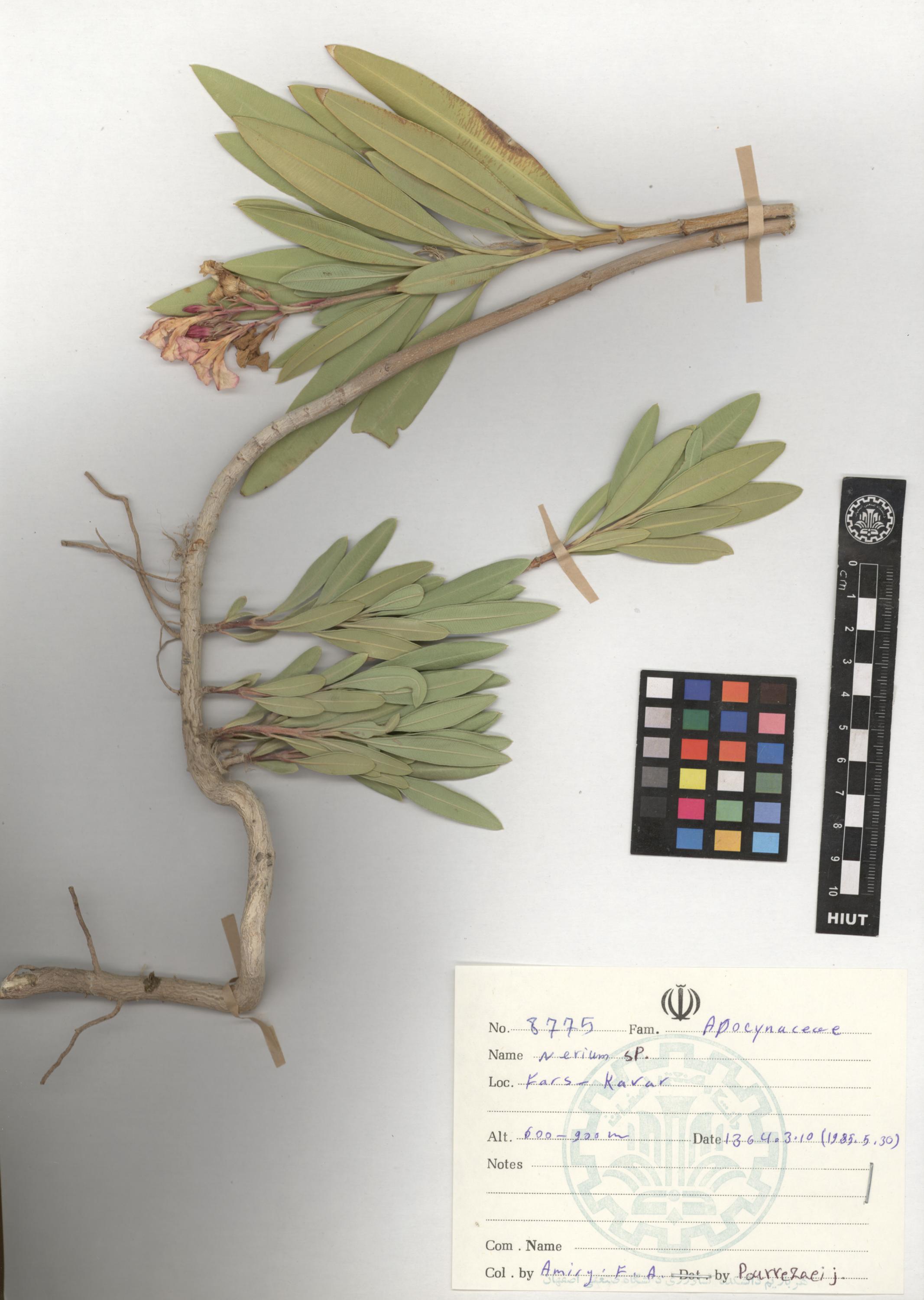8775 Family : Apocynaceae Herbarium Number : 8775 Species Name : Nerium sp. herbarium date 5/31/1985 herbarium alternate 600-900m herbarium col by Amiry F.A. herbarium det by Pourrezaei J. herbarium country Iran herbarium province Fars herbarium location Kavar herbarium lat herbarium long herbarium annotations