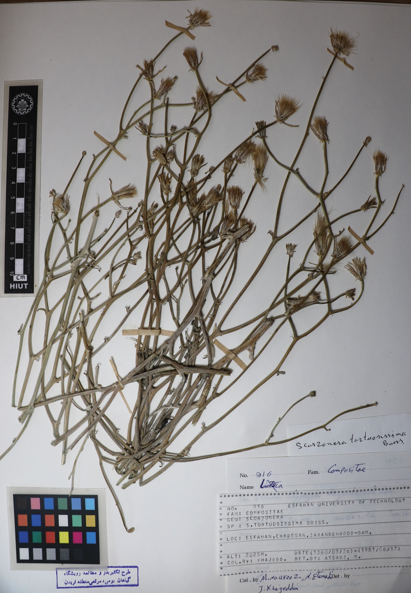 916 Family : Asteraceae (Compositae) Herbarium Number : 916 Species Name : Scorzonera tortuosissima Boiss. herbarium date 6/17/1981 herbarium alternate 2025m herbarium col by M.Nowroozi,N.Etemadi herbarium det by herbarium country Iran herbarium province Isfahan herbarium location Chadegan herbarium lat herbarium long herbarium annotations
