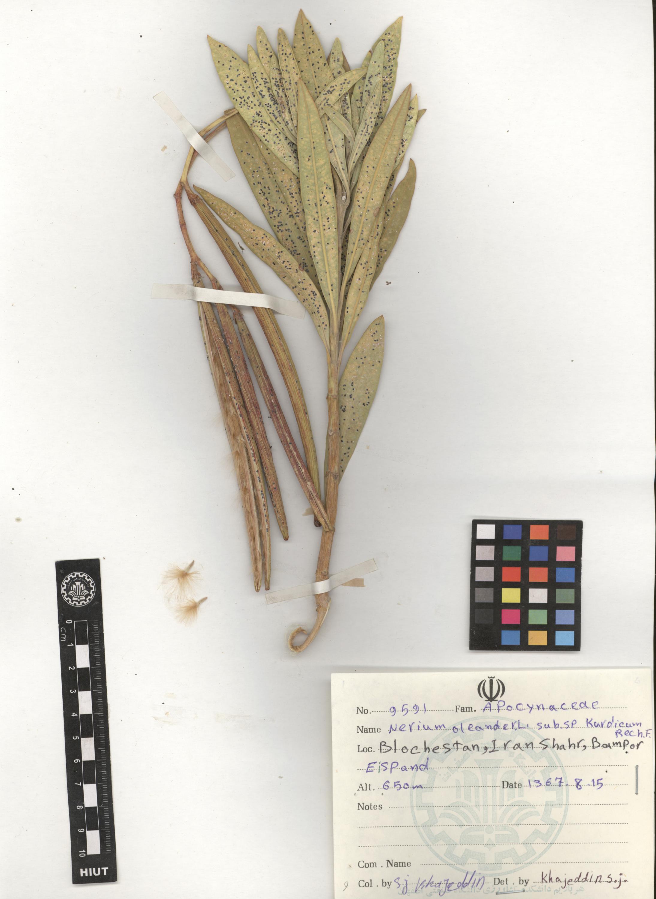 9591 Family : Apocynaceae Herbarium Number : 9591 Species Name : Nerium oleander L. herbarium date 11/6/1988 herbarium alternate 650m herbarium col by Khajeddin S.J. herbarium det by Khajeddin S.J. herbarium country Iran herbarium province Sistan and Baluchestan herbarium location Iranshahr herbarium lat herbarium long herbarium annotations