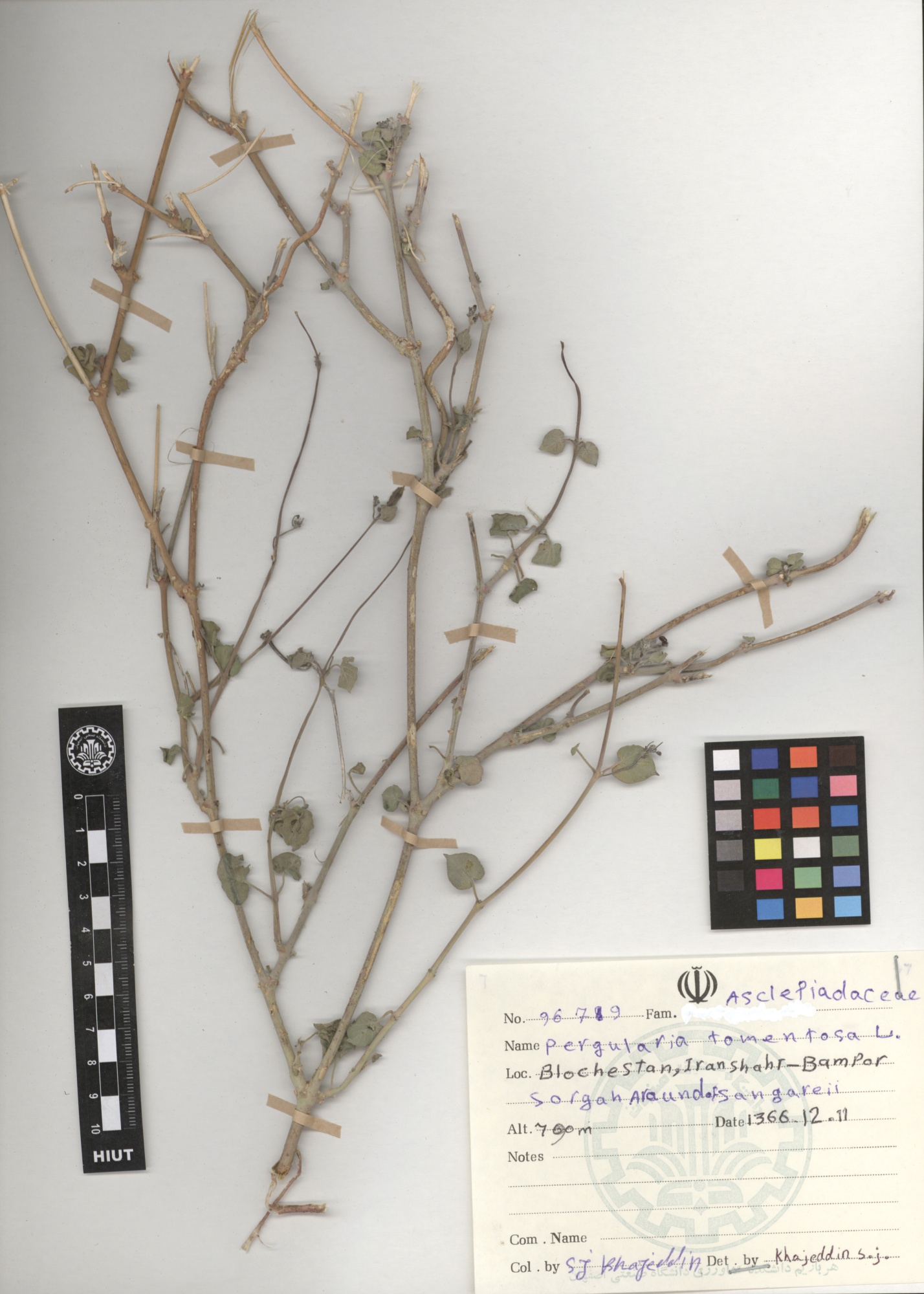 9679 Family : Apocynaceae Asclepiadaceae Herbarium Number : 9679 Species Name : Pergularia tomentosa L. herbarium date 1366/12/11 herbarium alternate 790m herbarium col by Khajeddin S.J. herbarium det by Khajeddin S.J. herbarium country Iran herbarium province Sistan-Va-Balouchestan herbarium location Iran-Shahr herbarium lat herbarium long herbarium annotations