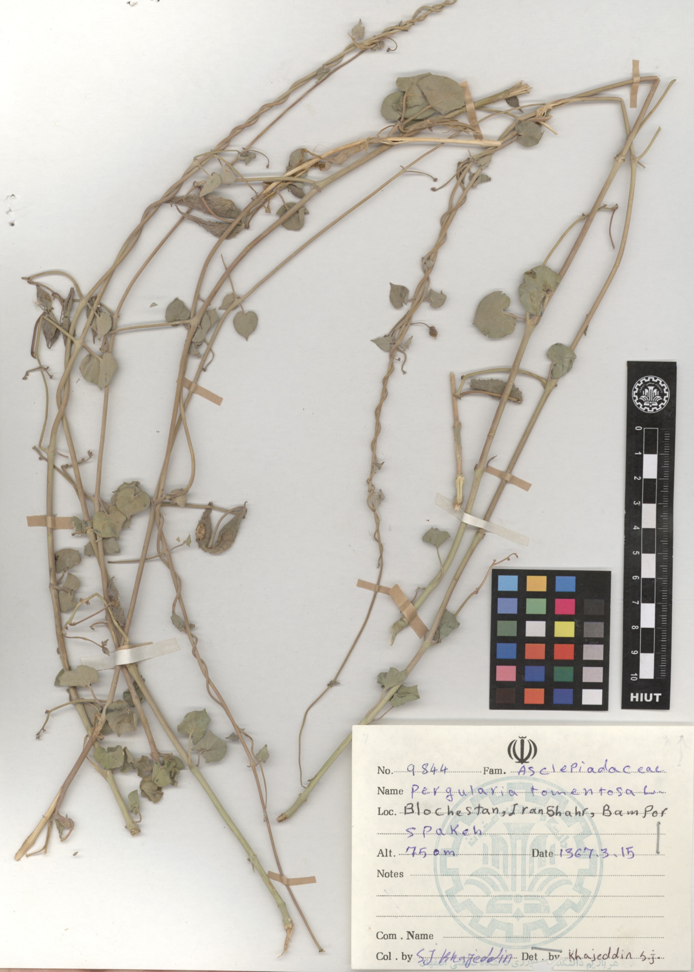 9844 Family : Apocynaceae Asclepiadaceae Herbarium Number : 9844 Species Name : Pergularia tomentosa L. herbarium date 1367/03/15 herbarium alternate 750m herbarium col by Khajeddin S.J. herbarium det by Khajeddin S.J. herbarium country Iran herbarium province Sistan-Va-Balouchestan herbarium location Bampor herbarium lat herbarium long herbarium annotations