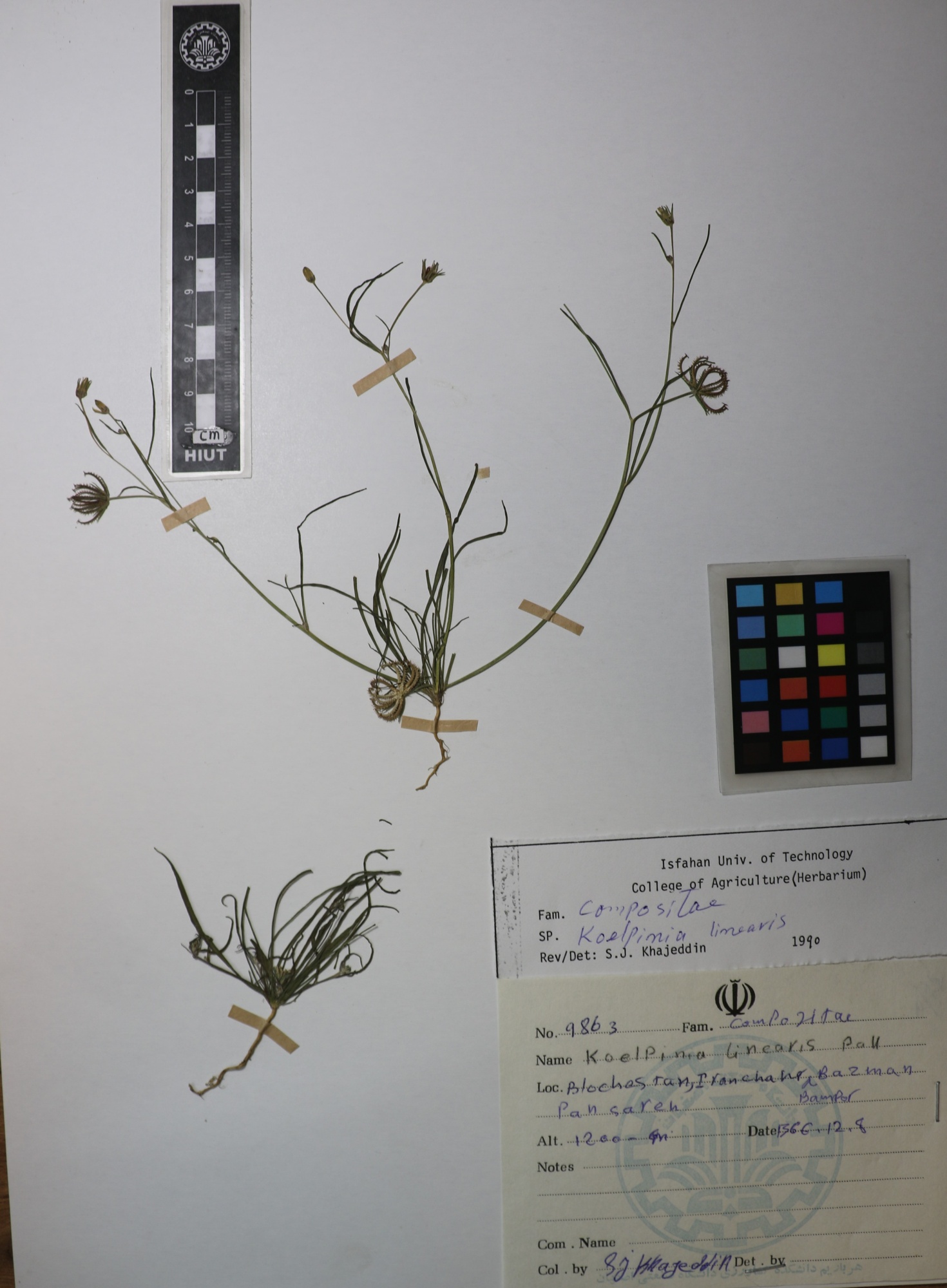 9863 Family : Asteraceae (Compositae) Herbarium Number : 9863 Species Name : Koelpinia linearis Pall. herbarium date 2/27/1988 herbarium alternate 1200m herbarium col by S.J.Khajeddin herbarium det by herbarium country Iran herbarium province Blochestan herbarium location Iran shahr herbarium lat herbarium long herbarium annotations