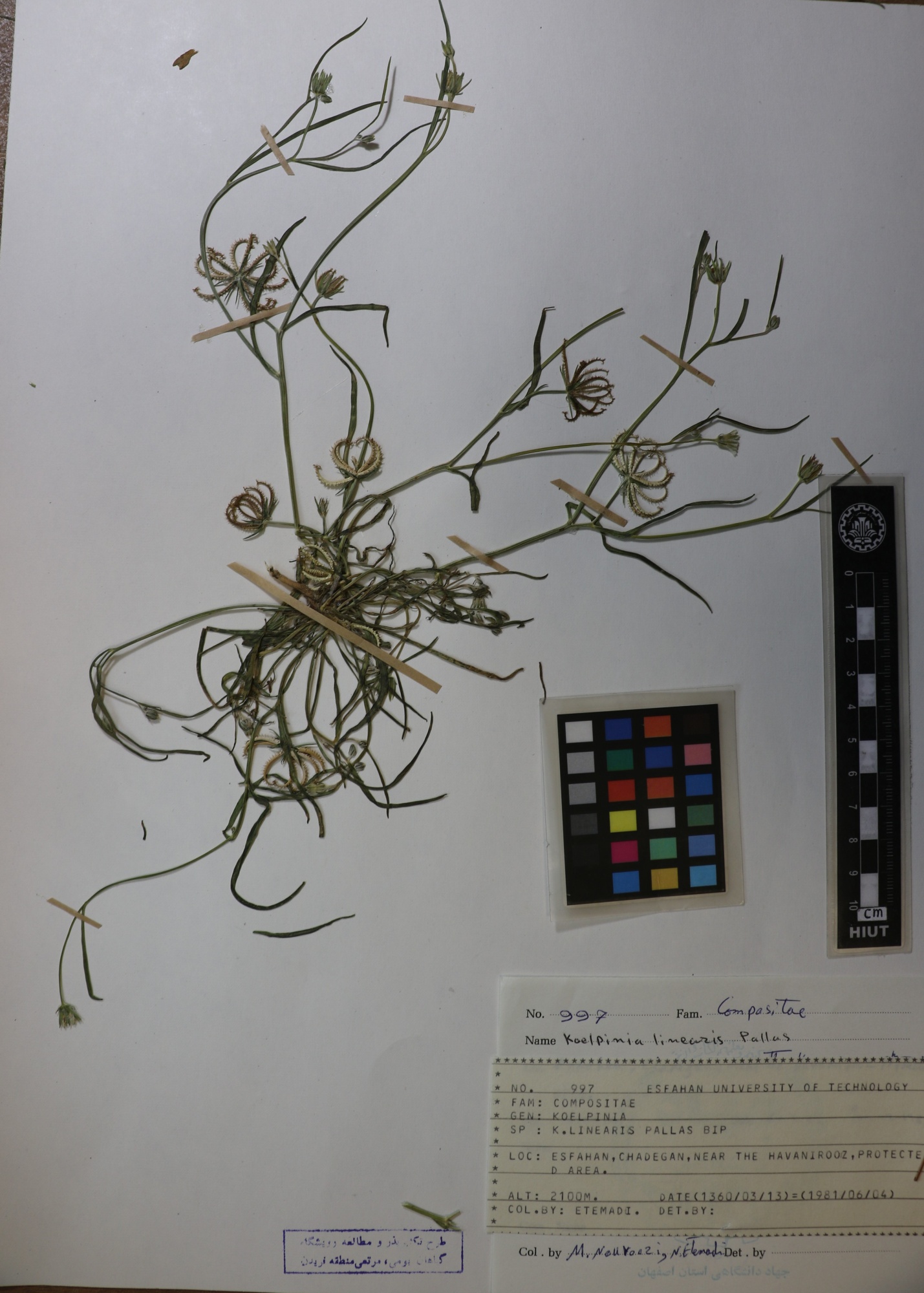 997 Family : Asteraceae (Compositae) Herbarium Number : 997 Species Name : Koelpinia linearis Pall. herbarium date 6/4/1981 herbarium alternate 2100m herbarium col by N.Etemadi herbarium det by herbarium country Iran herbarium province Isfahan herbarium location Chadegan herbarium lat herbarium long herbarium annotations
